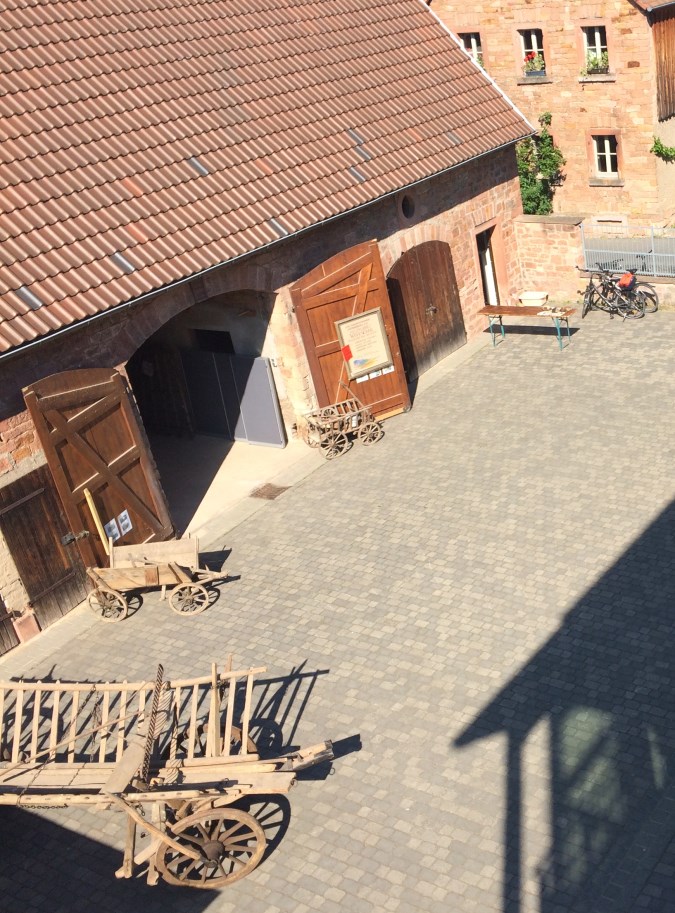 Blick von der Plattform der Außentreppe auf das Nebengebäude der Sandsteinschule