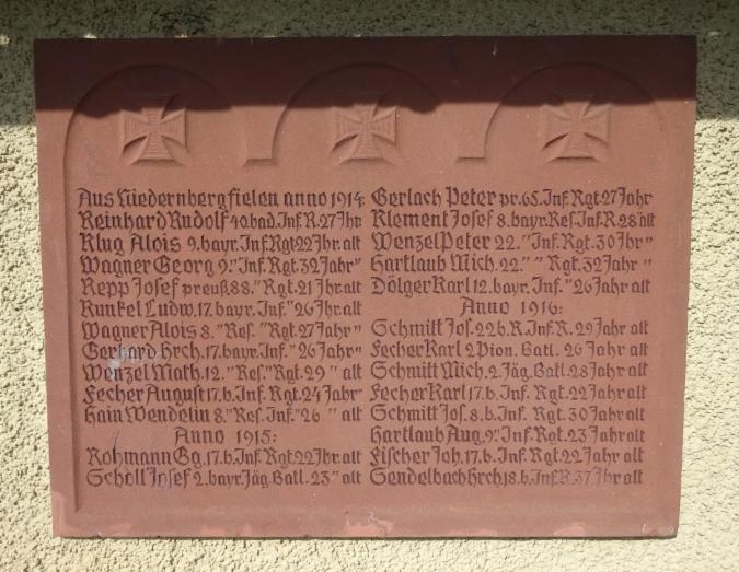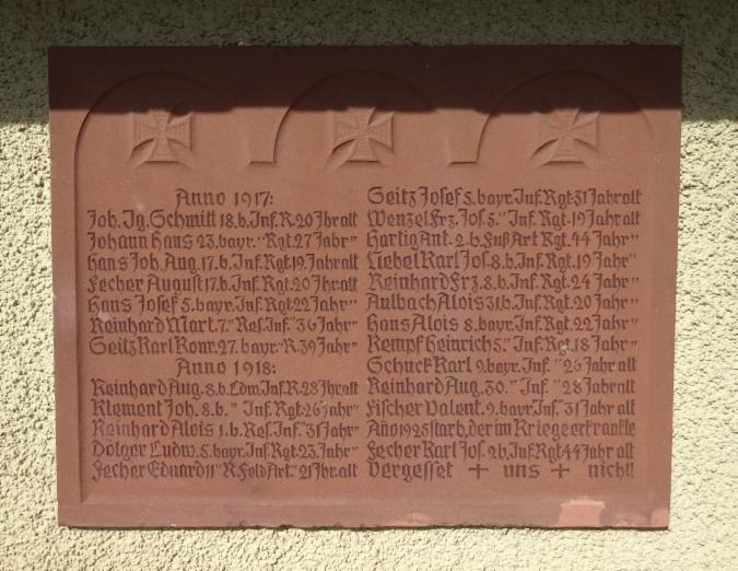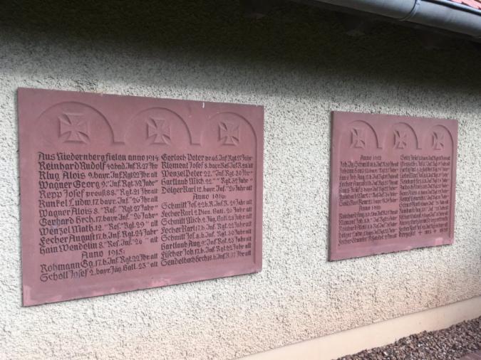 An der Außenseite der Kapelle befinden sich die Gefallenentafeln des ersten Weltkriegs, die sich ebenfalls im Heiligenhäuschen befunden hatten. Der dazu gehörige „Herz-Jesu-Stein“ ist im Innern der Kapelle aufgestellt, siehe Bild weiter oben.