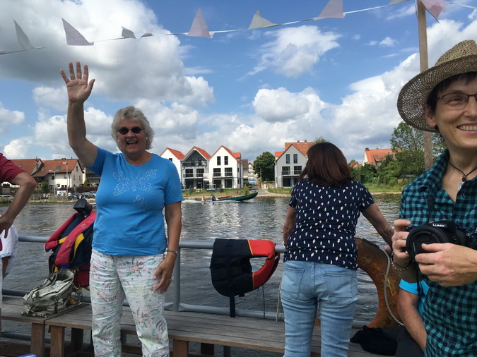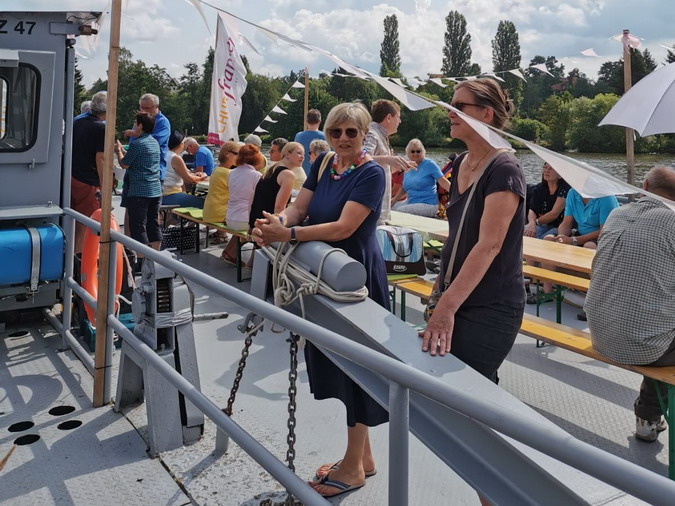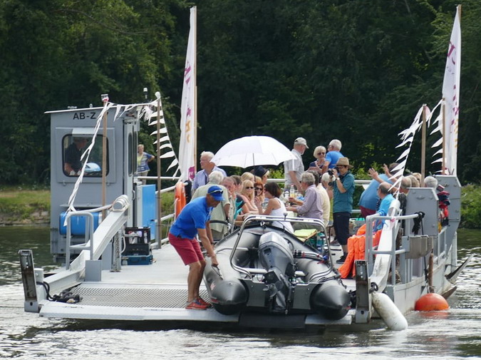 Vor der Roland-Schwing-Brücke, auf der unsere Fotografen Jürgen und Engelbert auf uns blicken, macht die Fähre einen komplette, elegante Drehung. Anlass für Rudi und Gisela, einen "Fährwalzer" in Anlehnung des Schneewalzers zu tanzen. Die Kulisse ähnelte einem Opernball, Zuschauer von den unteren und oberen Rängen. Eine herrliche Einlage!
