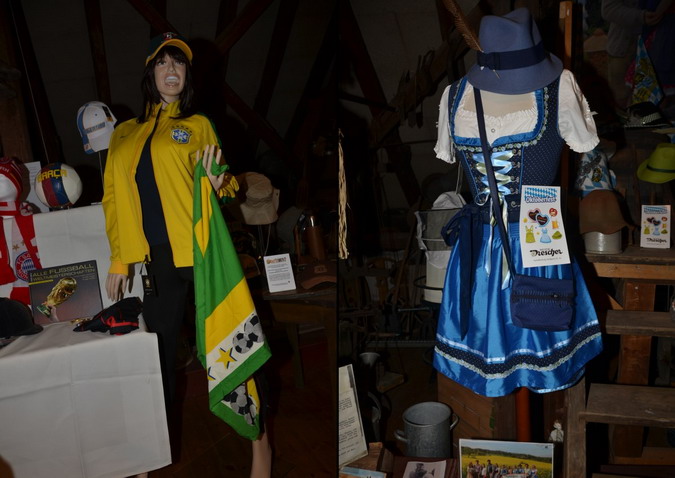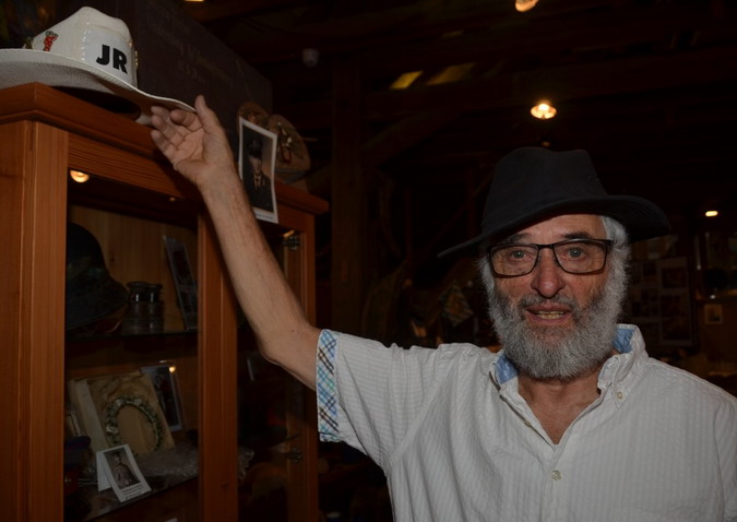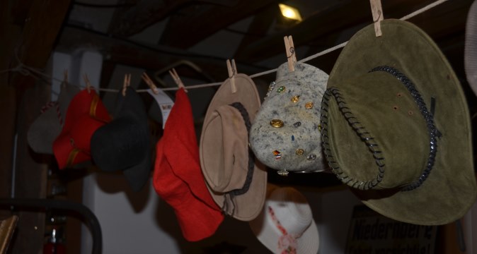 Eberhard mit "JR"s Faschingshut, ein Original aus Texas, welches jährlich an Fasching das Haupt unseres Bürgermeisters ziert. Dahinter der Reservistenhut von Heimatpfleger Albert Wagner inkl. Foto aus der damaligen Zeit.