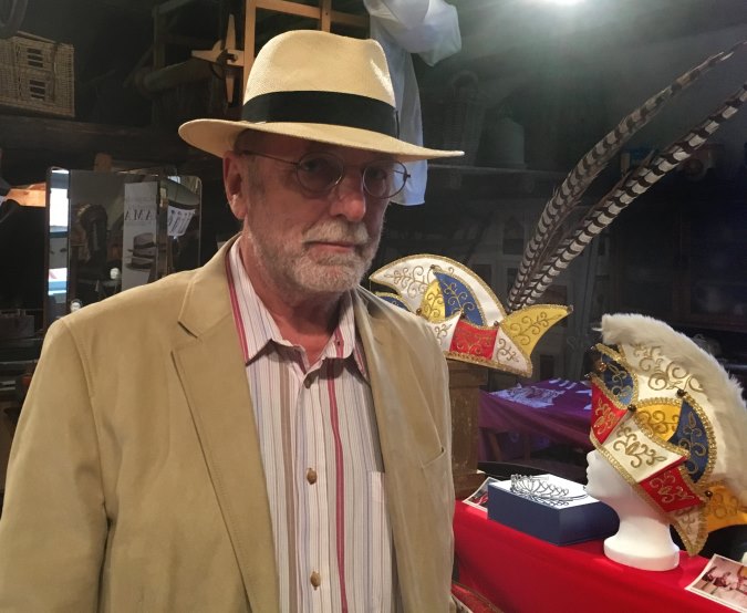 rechts die Mütze einer seiner Auszubildenden aus der "Blechernen Katz'". Unten: ehemalige Polizeimützen von Norbert Hildebrandt.