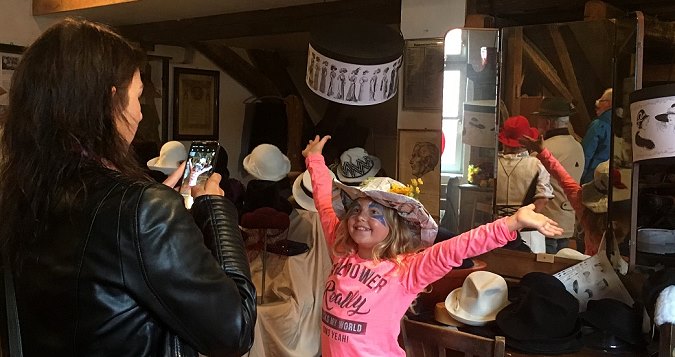Hüten im Spiegel testen, ob man ein sogenanntes "Hutgesicht" hat bzw.