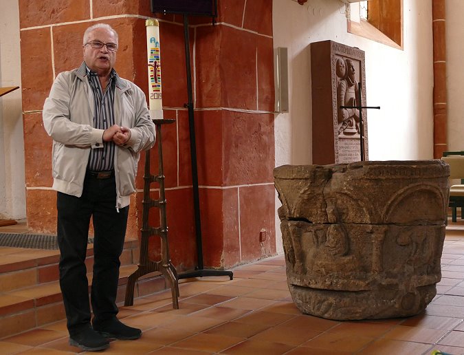 Der Taufstein der Walpurgiskirche entstand im 11. oder 12. Jahrhundert und steht im Chor der Kirche.