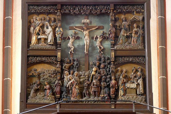Der spätgotische Schnitzaltar mit Szenen der Passion und dem Leben Jesu.