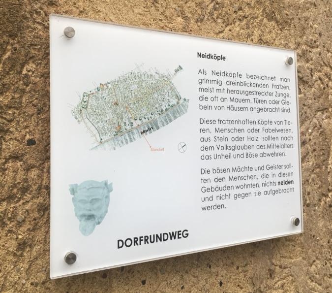 Fratzenhafte Köpfe zur Abwehr von bösen Geistern. Der Begriff „Neidkopf“ geht auf das althochdeutsche Wort „Nid“ zurück, was übersetzt Neid, Hass oder auch Zorn bedeutet. Die bösen Mächte sollten Unheil abwenden, den abergäubischen Bewohnern des Hauses nichts neiden, sie in Ruhe lassen. Im Regelfall wurden die schauderhaft wirkenden Tierköpfe an der Hausecke angebracht, welche morgens nach Sonnenaufgang als erstes von der Sonnen angestahlt wird, was sich positiv auf das Haus und auf die Abwehr der Dämonen auswirken sollte.