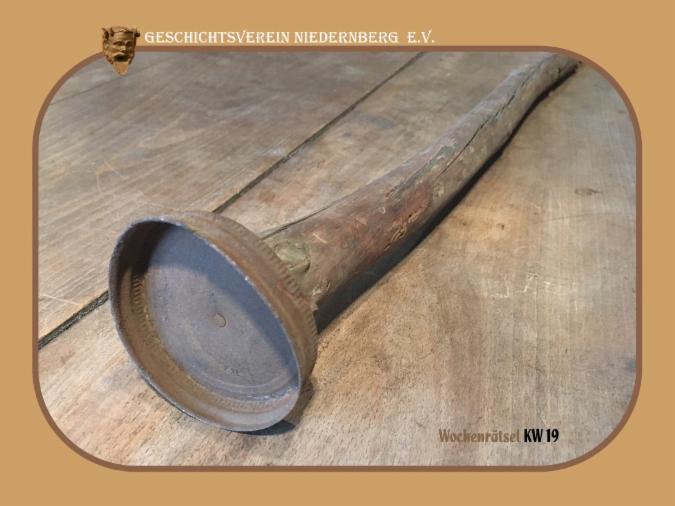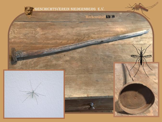 Es handelt sich um einen selbst gebauten Schnakenfänger. Je nach Eigenbau viel dieser ca. 1 m lange "Schnoogefenger" etwas unterschiedlich aus. Der an einen Holzstiel genagelte Belechdeckel wurde mit etwas