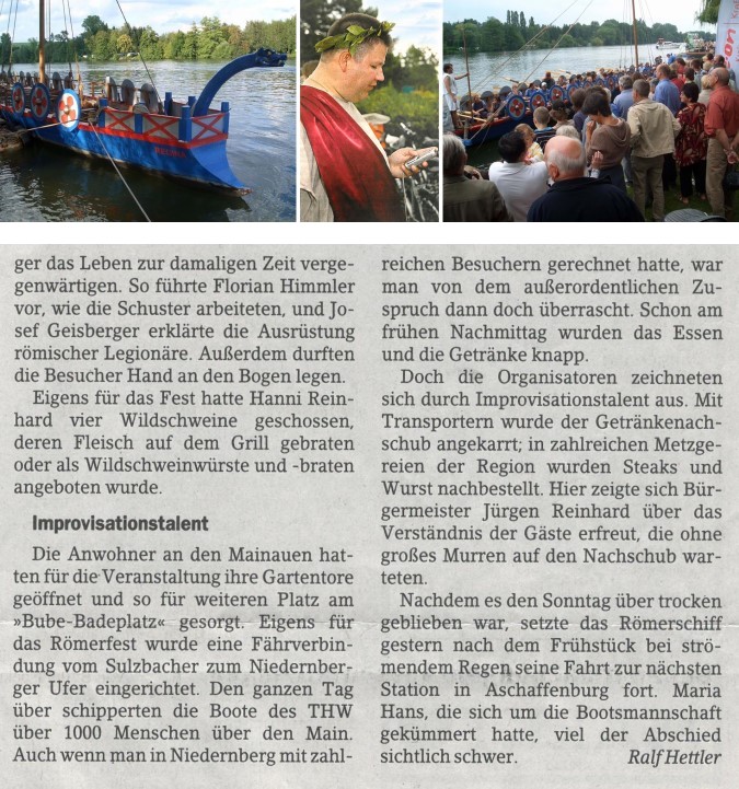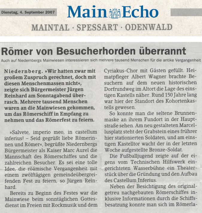 Event des Jahres 2007 in Erinnerung sein, ein Riesen-Spektakel, welches da am "Bubenbadeplatz" von der Geimeinde Niedernberg und Ortsvereinen auf die Beine gestellt wurde. Den Programmablauf der verschiedenen Mainlimes- Anlegestellen kann man hier... nachlesen, anbei einer der vielen damaligen Medienberichten und einige Impressionen und Videos aus den "Mainauen" Niedernbergs: