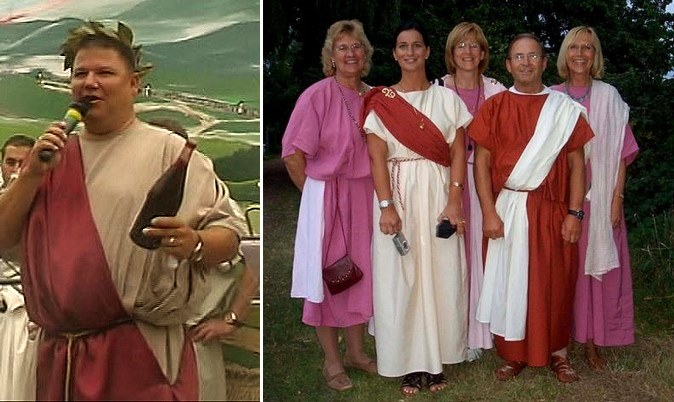 Kaiser Marc Aurel (alias Bgm. Jürgen Reinhard) bei einer Ansprache auf der Mainbühne. Unsere Geschichtsvereins-Truppe um Maria Hans und Heimatpfleger Albert Wagner ließ die Besucher bei zwei Führungen auf dem historischen Dorfrundweg in die römische Vergangenheit Niedernbergs eintauchen.