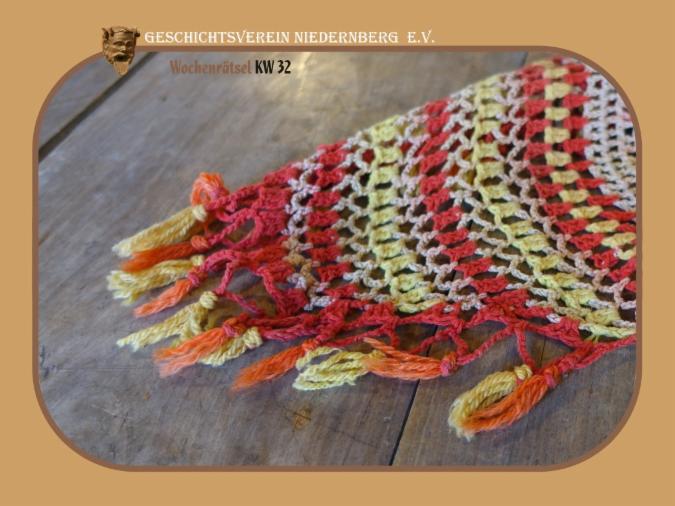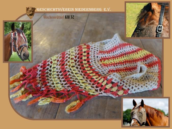 Es handelt sich um eine gehäkelte Fliegenmaske, wie man sie früher bei Pferden oft sah. Durch die Ohraussparungen wurde sie am Kopf fixiert. Heute gibt es solche Versionen des Fliegenschutzes nicht mehr. Pferdeköpfe sind beliebte Ziele für Insekten, was für das Tier natürlich sehr unangenehm ist, da es sich nicht dagegen wehren kann. Fliegen & Co können u.a. zu Augenendzündugen führen. Heute gibt es neben verschiedenen Arten von Fliegenmasken auch Fransenbänder, durch Bewegung des Kopfes werden die lästigen Insekten vertrieben.