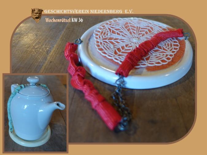 handelt sich um einen Kannenuntersetzer mit Deckelhalter. Beim Ausschenken bestand die Gefahr, dass der Deckel