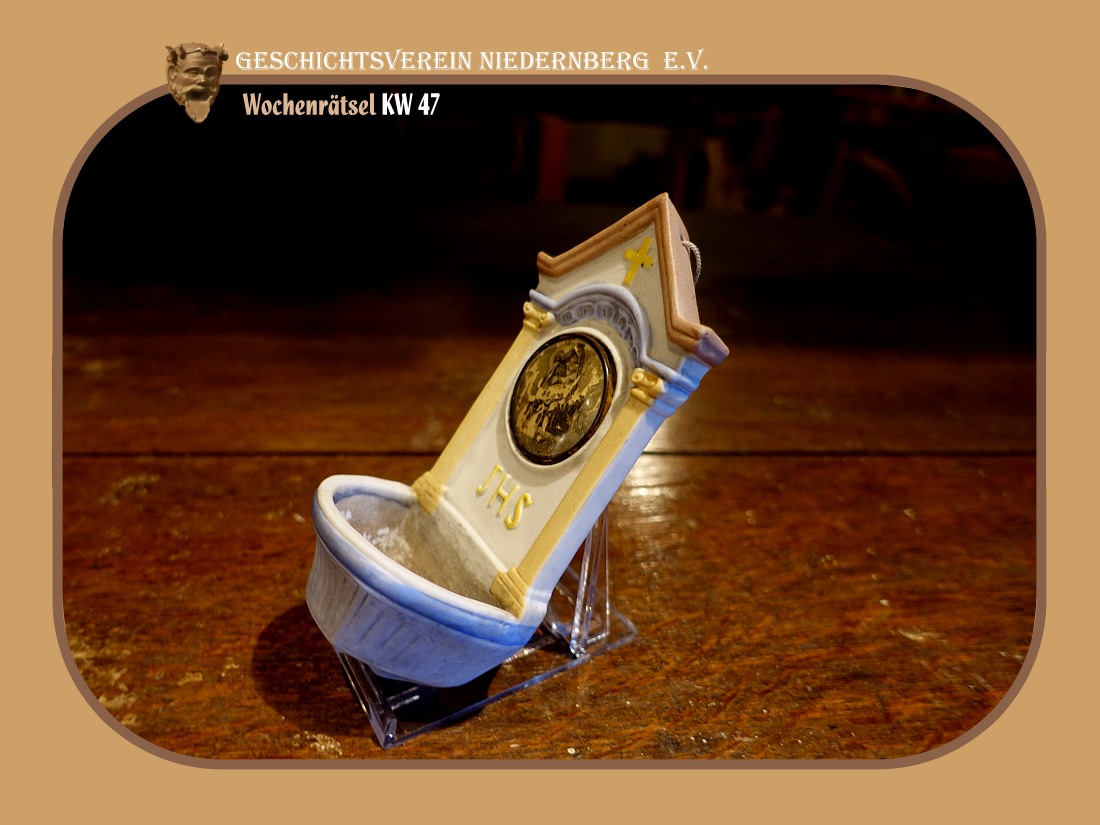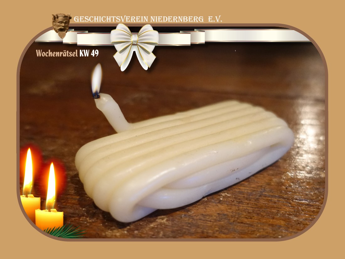 Auch schon lange vor der Erfindung der Glühbirne gab es zahlreiche Möglichkeiten, Licht zu machen. Eine davon waren die Kerzen. Und speziell beim Wachsstock, der im 12. Jahrhundert das erste Mal urkundlich erwähnt wurde und in ganz Europa verbreitet war, handelt es sich um eine sehr lange, sehr dünne „Endlos“-Wickelkerze. Dadurch, dass der weiche Wachs um sich selbst herum zu einem “Knäuel / Stock” gewunden wird, erhält man durch das Abwickeln eine stete Flamme mit langer Brenndauer, ideal auch als Leselicht, u.a. auch für das Gebetbuch während der dunklen Jahreszeit in der Morgenandacht und Abendmesse. Aus Sicherheitsgründen, damit die Betbank nicht ankokelt, legte man den Wachsstock oftmals in eine kleine Schale. Der hier abgebildete Wachsstock gehörte Anna Hans, die ihn um die 1920/30 in der St. Cyriakus-Kirche verwendete. Nachdem 1920 der Strom in Niedernberg einzog, wurde er in späteren Jahren dann auch in der Pfarrkirche verlegt und die Wachsstöcke verloren an Bedeutung. Heute noch werden ähnliche Ausführungen teilweise noch bei Andachten als Anzündhilfe für die Kerzen verwendet.