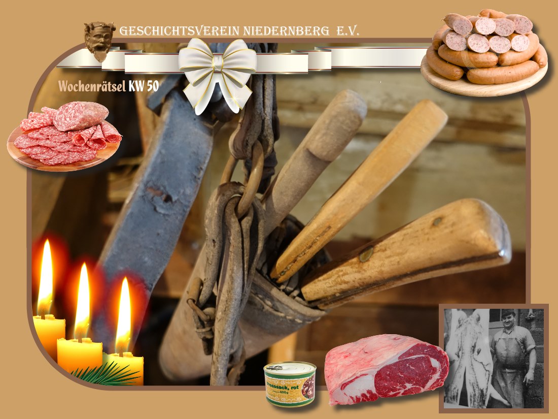 Es handelt sich um ein altes Metzger-Halfter, welches sich die Schlachter / Fleischer mit einer Ledergarnitur um die Hüfte hängen. In diesem „Messerköcher“ tragen die Metzger beim Schlachten die notwendigen Utensilien, meist auch inkl. Wetzstein, griffbereit bei sich. Im Bild zu sehen der Niedernberger Edmund Hartlaub beim Schlachten in den 70ern.