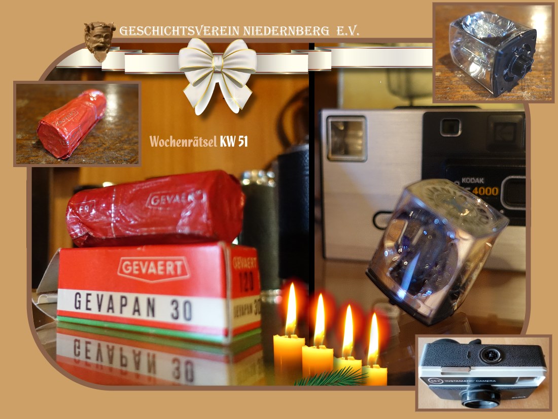 Gevapan 30“ (gehört heute zur Agfa-Gruppe) und einen klassischen Blitzwürfel