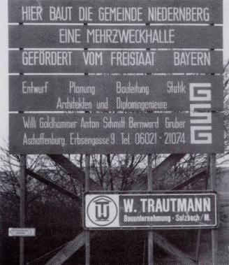 Spatenstich am 24.10.1986 durch Bürgermeister Hans Herrmann und Baustellenschild (Heimatbuch Seite 269)