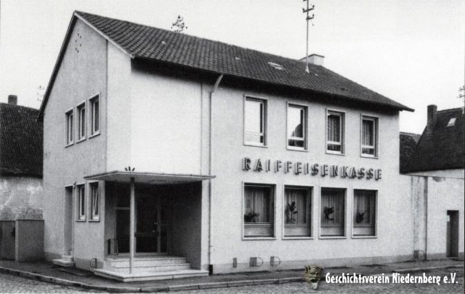 1961 verlegte die Raiffeisenbank ihre Geschäftsräume von der Schulstraße (gegenüber der Sandsteinschule) in die neu errichtete Geschäftsstelle in der Hauptstraße/Ecke Kirchgasse. Am 17. Dezember 1961 wurde das Gebäude seiner Bestimmung übergeben. Damals befanden sich in einem Kellerraum, der durch einen getrennten Eingang zu erreichen war, die Tiefkühltruhen der damaligen Frostfachgemeinschaft (Tiefkühltruhen in Privathaushalten waren zu dieser Zeit noch nicht üblich). Bereits 1973 erweiterte man das Gebäude durch einen Flachbau. 1987 wurde der Flachbau aufgestockt (Fertigstellung 1988). Damit erhielt das Gebäude sein heutiges Aussehen. Vor dem Bau der Raiffeisenbank standen auf dem Grundstück die Reste eines landwirtschaftlichen Anwesens, das 1945 in Brand geschossen worden war.