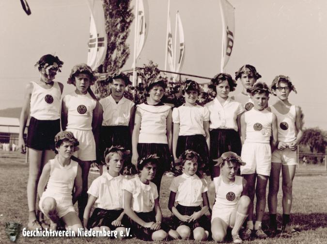 Foto: Teilnehmer des TV Niedernberg. Die Sieger beim Gauturnfest erhielten Lorbeerkränze. Weitere Fotos siehe hier...