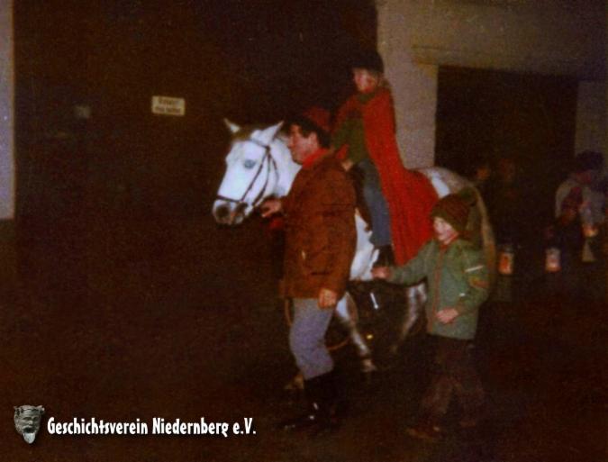 Foto: Blumenstraße Anfang der 1970er Jahre: Vater Helmut Reinhart (Lindenhof) führt mit einem Pferd den Martinszug an, seine Tochter Judith trägt einen roten Umhang, Tochter Heidi begleitet die beiden.