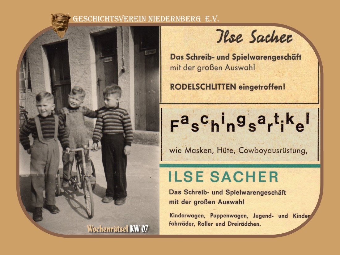 Sacher dort diese oben genannten Spielsachen verkauft, siehe Amtsblatt-Annocen aus dieser Zeit in der ersten Fotocollage (per Mausklick vergrößerbar). Auf der zweiten Fotocollage ein "Rodelbild", auf welchem man im Hintergrund das