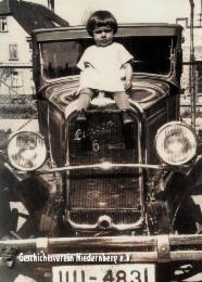 auf der Kühlerhaube, Foto um 1932. Es war das erste Auto in Niedernberg