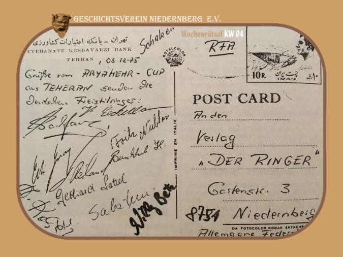 Grußkarte der Deutschen Nationalringer (Freistil) vom Aryamehr-Cup in Teheran (Iran/Persien) an den damals 1975
