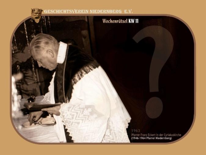 Wir sehen Pfarrer Eckert im Jahre 1963 bei einer feierlichen Zeremonie in der Cyriakus Pfarrkirche. Welche Niedernberger Persönlichkeit stand bei diesen Feierlichkeiten regelmäßig mit vorne am Altar, hier im Bild im Rücken des Geistlichen?