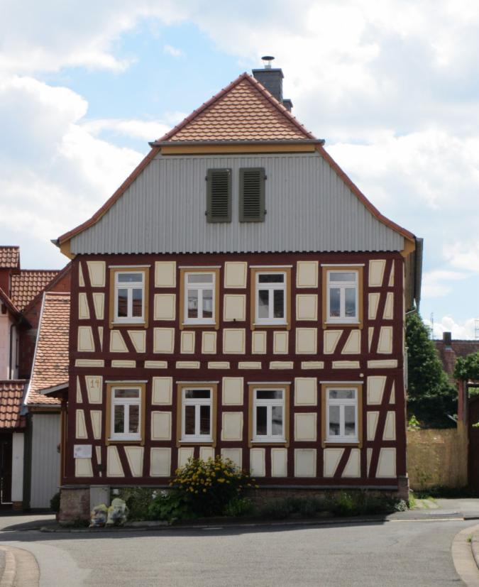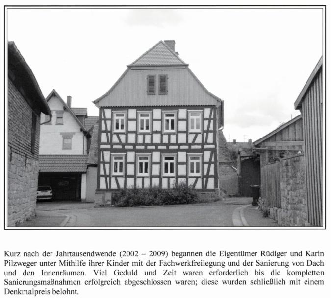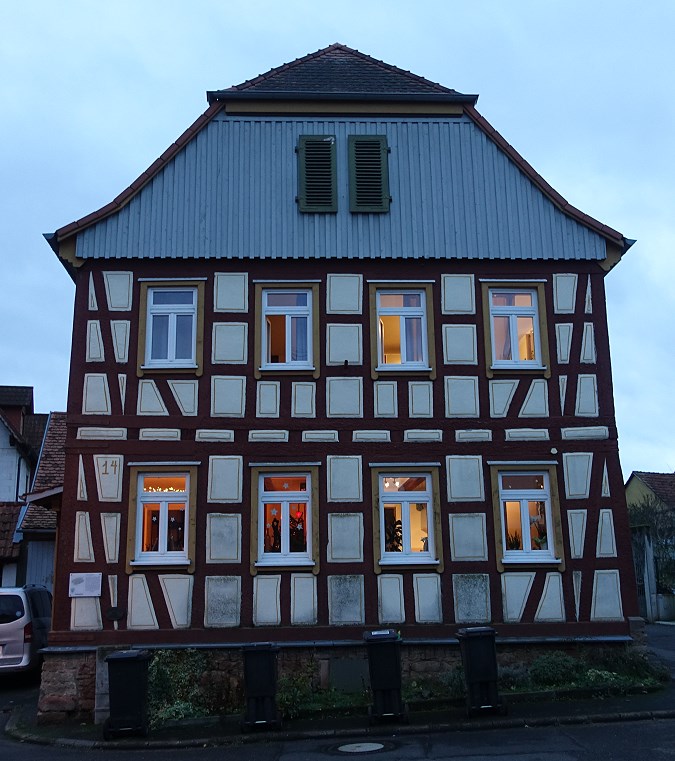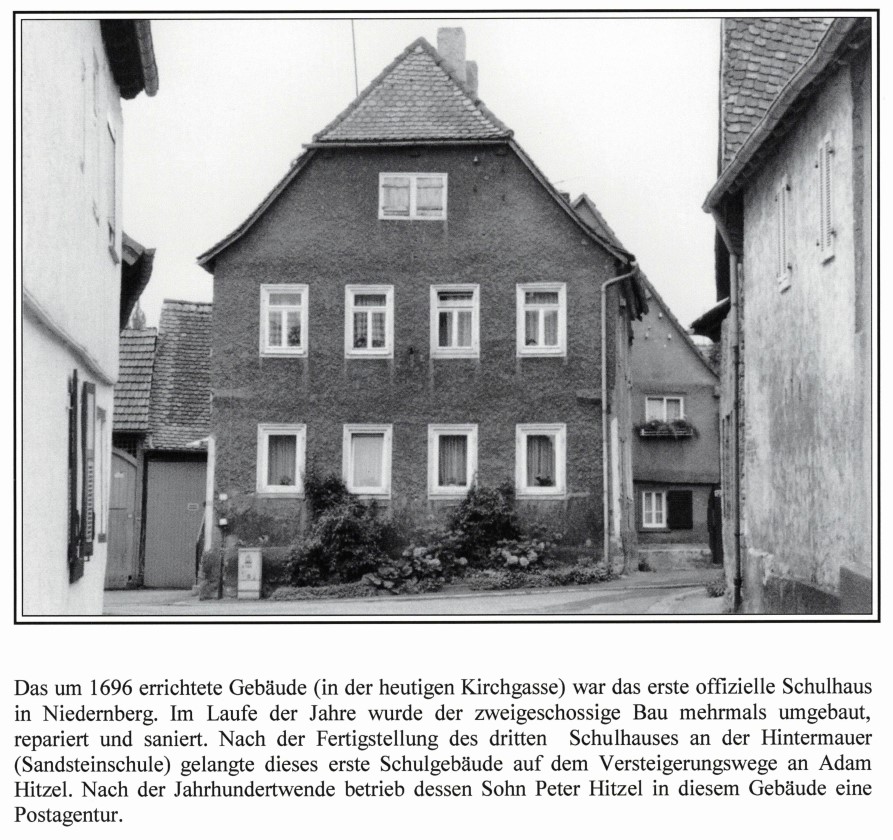 1696 wurde das erste Schulhaus in Niedernberg in der Kirchgasse errichtet (heute Haus Nr. 14), damals nannte man diesen Teil der Kirchgasse „Koben Zehl“. Im Schulgebäude befand sich im Erdgeschoss ein einziges Klassenzimmer für alle Schüler, darüber die Lehrerwohnung. Dem Gebäude wurden 1700 ein Backofen und 1712 ein neuer Stall für das Vieh des Schullehrers hinzugefügt. Im Laufe der Jahre wurde das Haus mehrmals umgebaut, repariert und saniert. Vor 1696 fand in Niedernberg die Unterrichtung der Jugend vermutlich in der Wohnung des Pfarrers, Lehrers oder in kirchlichen Räumlichkeiten statt. Nach der Fertigstellung des dritten Schulhauses (Sandsteinschule) im Jahr 1876 ersteigerte Adam Hitzel das Anwesen; daher heute der Name „Hitzelseck“ für diesen Teil der Kirchgasse. Das inzwischen restaurierte Fachwerkgebäude ist eine Bereicherung für unser Ortsbild.