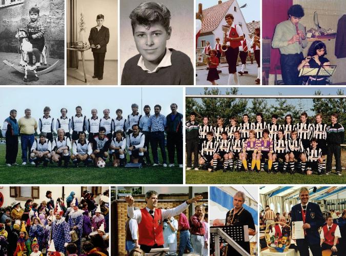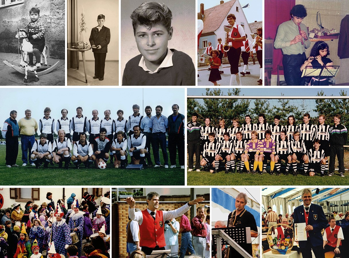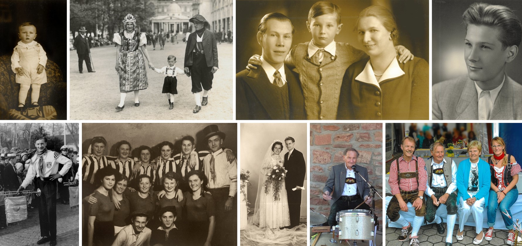Fotos: Oben links der kleine Walter auf einem Sessel und 1938 mit Mutter Josefine und Vater Anton Dürl in feiner Tracht an der 180 m langen Hauptkolonnade (auch Maxim-Gorki-Kolonnade genannt), dem Wahrzeichen von Marienbad. Daneben ein Familienfoto um 1943/44 aus einem Atelier und Walter als fescher, junger Mann in Niedernberg. Untere Reihe: Seine Passion ist die Musik. Angefangen hat Walter Ende der 50er Jahre mit der Fanfare, später wechselte er zum Schlagzeug über. Ein Gruppenfoto der Spvgg Niedernberg, vorne zu sehen Walter und sein Kumpel Seppel Hesbacher. Neben weiteren bekannten Gesichtern ist auch seine spätere Ehefrau Sieglinde (geb. Hartlaub) abgebildet. Bei den beiden sprang, wie bei einigen befreundeten Paaren auch, der Funke bei einem Faschingsball im Gasthaus Zur Linde über. Hochzeitsfoto von 1957, als Trommler bei „Jürgen und seine Freunde“ sowie ein Familienfoto mit Frank, Sieglinde u. Susanne zum 80. Geburtstag im Mai 2014.