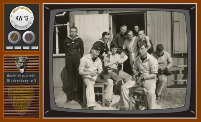 Diese Aufnahme entstand vor 80 Jahren. Wir befinden uns inmitten des zweiten Weltkrieges in Wesermünde (heute Bremerhaven), im Jahr 1942. Matrosen putzen vor der Baracke ihr Schuhwerk und genießen die Sonnenstrahlen. Der junge Mann, der vorne links seinen Stiefel betrachtet, ging in die Niedernberger Geschichte ein. Um wen handelt es sich?