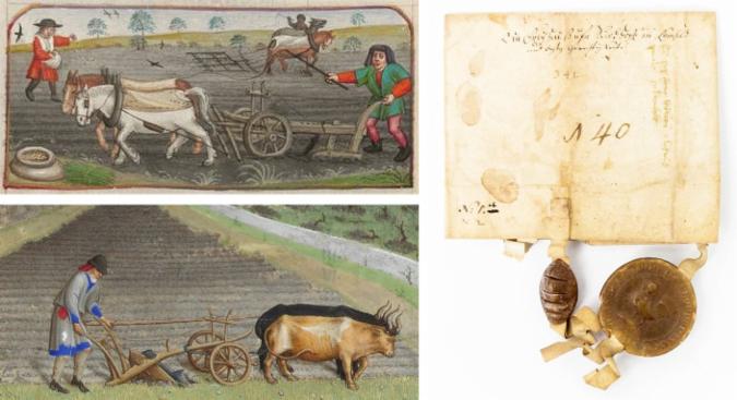 Seiten 50 und 57 bis 58, Bilder und Urkunde aus dem 14. Jahrhundert. Zu damaligen Zeiten wurde Gemälde nur für die obere Schicht (Adelige, Gutsherren, Landesfürsten etc.) angefertigt. Dies erklärt, warum auf den abgebildeten Malereien Ochsen und Pferde als Zugtiere zu sehen sind. Bei der normalen Landbevölkerung wurden überwiegend Kühe eingespannt.