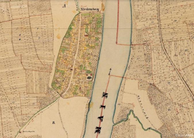 Amerika ausgewandert sind. Die historische Karte zeigt das in den Ortsmauern eingebette Niedernberg um 1850/1860 samt seiner Gemarkung auf Sulzbacher Seite, vor Bau des Bahnhofes und der Eisenbahnstrecke.