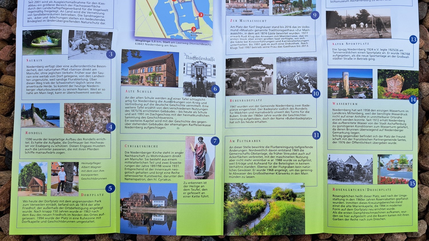gestaltet, siehe Muster-Hinweistafeln Großeltern, Wasserweg Main Tafel 1, Tafel 2 und Detailansicht. Der Kulturweg wird bis an die nördliche Gemarkungsgrenze zu Aschaffenburg geplant, 25 Hinweistafeln sind vorgesehen. Siehe Übersicht (Nachtrag: Mittlerweile gekürzter Wegverlauf und Reduzierung der Infotafeln, endgültige Karte siehe hier...)