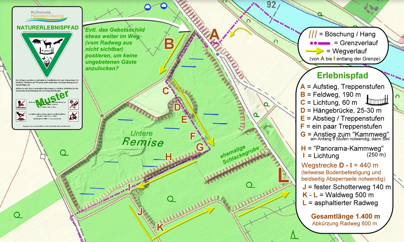 Niedernberg, Dr. Gerrit Himmelsbach und Dr. Anika Magath (Spessartprojekt), Startpunkt ist der Parkplatz am Honischbeach. Mit integriert auf dem geplanten Kulturweg ist (damals noch) das ehem. Kiesgrubengebiet ums "schwarze Loch", hier geht es durch seit vielen Jahrzehnten der Natur überlassenes Gelände. Eine ca. 30 m. lange Hängebrücke wird an einer steilen Böschung in die Planung mit eingeschlossen, ebenso wie auch Trittbefestigungen und Abgrenzungen der Gehwege durch Seile. Eine Übersicht der vorgesehenen Strecke durch das ehem. Kies-Grimm-Gelände siehe