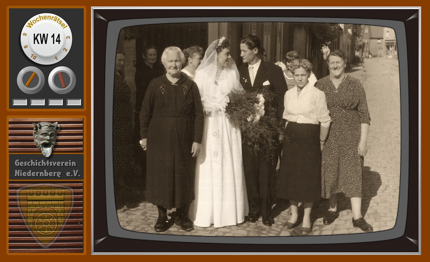 Die beiden Vermählten, die sich bei einem Gruppenfoto an der Hauptstraße in die Augen schauen, sind Rosa und Heinrich Frieß. Anfang der 50er Jahre lernen sich „Resi & Heiner“ beim Tanz im Gasthaus „Zur Rose“ (Eichelsbach) kennen, 1956 heiratet Heiner von Sommerau nach Niedernberg. Mit seiner langjährigen Tätigkeit im ehemaligen Raiffeisen Lagerhaus (bis 1987) geht er in die Ortsgeschichte ein. Weitere Infos u. Bilder findet man auf unserer Webseite in der Rubrik „Persönlichkeiten/Banken, Versicherungen“.
