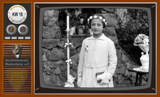 Am Sonntag, den 8. Mai 2022, wird in Niedernberg die heilige Kommunion gefeiert. Viele Kinder im Alter von acht und neun Jahren empfangen erst-mals das Sakrament der Eucha-ristie. Wer ist das abgebildete Mädchen, welches 1938, also vor 84 Jahren, zur Kommunion ging? Kurz darauf feierte das Theaterstück "Furcht und Elend des Dritten Reiches" von Bertolt Brecht in Paris Premiere.