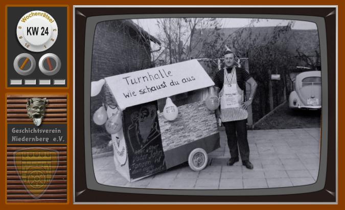 Das Rätselfoto entstand um 1967, das Motto des kleinen Faschingswagens lautete „Turnhalle, wie schaust du aus?“, darunter war zu lesen „Aber, aber, Vater Jahn, Tanzen ist doch auch Sport!“. Der Mann daneben, der sich die Nutzung des Hallen-Neubaus wohl anders vorgestellt hatte, ist Heinrich Buhler. Auf seine Initiative hin kam es 1961 zur Gründung des Turnvereins, für dessen Belange er sich nicht nur als Vorsitzender (1961-72) einsetzte. Als Gemeinderatsmitglied hat sich „Heini“ u.a. für den Bau der Turnhalle, die im Dezember 1966 eingeweiht wurde, stark gemacht. Auch seine eigenen Kinder hat er sportlich gefördert. Weitere Fotos und Infos findet man hier...