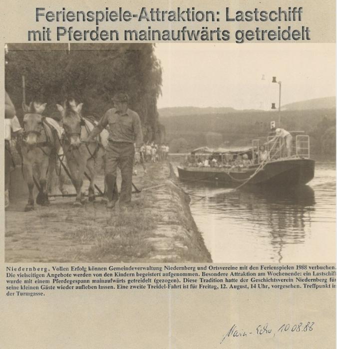 Main aufwärts zu ziehen. Auch Treidelpfad, Ziehweg oder Leinpfad genannt. Denn vom Mittelalter bis ca. 1890 wurden die Schiffe mit Leinen an Zugpferden befestigt, die
