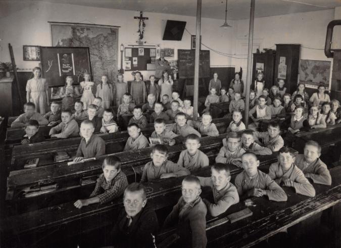 Die Schulbänke sind original aus der 1876 eingeweihten Sandsteinschule. Hier ein Blick in ein Klassenzimmer um 1920.