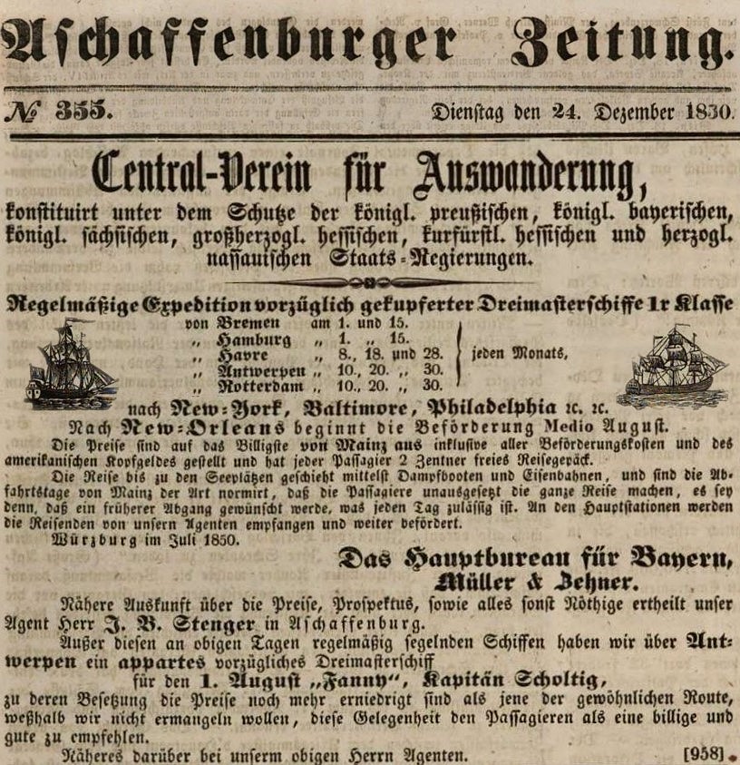 Fotos: Annocen mit Auswanderungen u.a. nach Baltimore. Lnks über den Agent J.B. Stenger in Aschaffenburg buchbar, rechts unten über den Buchbinder F.J. Kaufmann aus Walldürn.