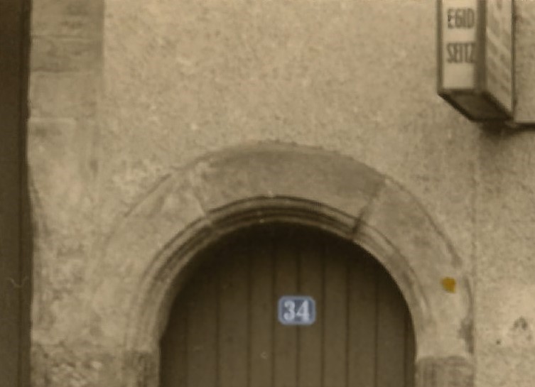 Fotos: Alte Hausnummer aus der Turmgasse (heute Turmgasse Nr. 1) und neue Hausnummer kurz nach der Einführung im Jahre 1953, vorher Hs.-Nr. 129, nachher Hauptstr. 34 (Gasthaus Zur Krone)