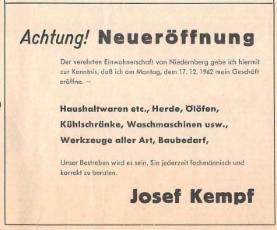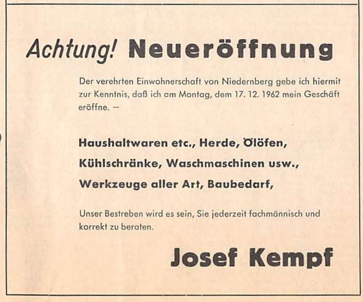 Im Dezember 1962 eröffnete Josef Kempf in der Hauptstraße 82 sein Geschäft. Angeboten wurden Haushaltswaren, Herde, Ölöfen, Ofenrohre, Werkzeuge, Eisenkleinteile und vieles mehr. Mit der Zeit kamen Geschirr, Geschenkartikel und Hochzeitstische hinzu. Seine Frau Helene führte das Geschäft, Josef seine Schlosserei. Das Haushaltswarengeschäft wurde Ende 2001 geschlossen.