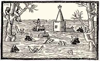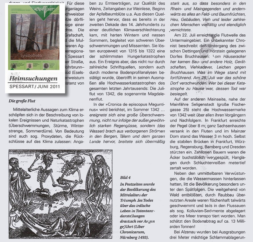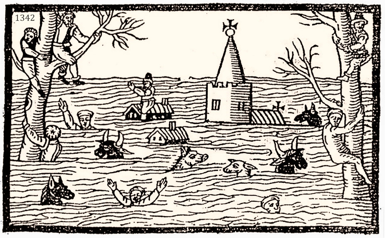 Im Juli 1342 ereignete sich das schwerste Hochwasser, das Mitteleuropa jemals heimsuchte; es war das sogenannte Magdalenen-Hochwasser. Am 22.7. (Gedenktag der hl. Magdalena) erreichte die Flutwelle das Untermaingebiet. Nach einem feuchten Frühsommer, der für konstant hohe Pegelstände der Flüsse sorgte, ließ eine Hitzewelle im Juli die Böden austrocknen, so dass sie kaum noch Wasser aufnehmen konnten. Ab etwa 19. Juli brachten tagelange Wolkenbrücke Unmengen an Niederschlag. Der Wasserstand des Maines lag damals weit über der Hochwassermarkierung von 1784 (höchste Markierung, die am Mainbogen an der Kirche angebracht ist, siehe Fotos). Somit dürfte ganz Niedernberg durch die Fluten in Mitleidenschaft gezogen worden sein. Die Fluten rissen Menschen, Tiere, Häuser und Brücken mit sich, z.B. in Würzburg massive Häuser und die steinerne Brücke. Die Felder wurden verwüstet und große Mengen fruchtbare Erde weggeschwemmt. An der Kahl bei Alzenau und im Elsavatal finden sich Erdablagerungen aus dieser Zeit bis zu drei Metern Höhe – das ursprüngliche Niveau der Kirche von Kloster Himmelthal lag drei Meter tiefer als heute