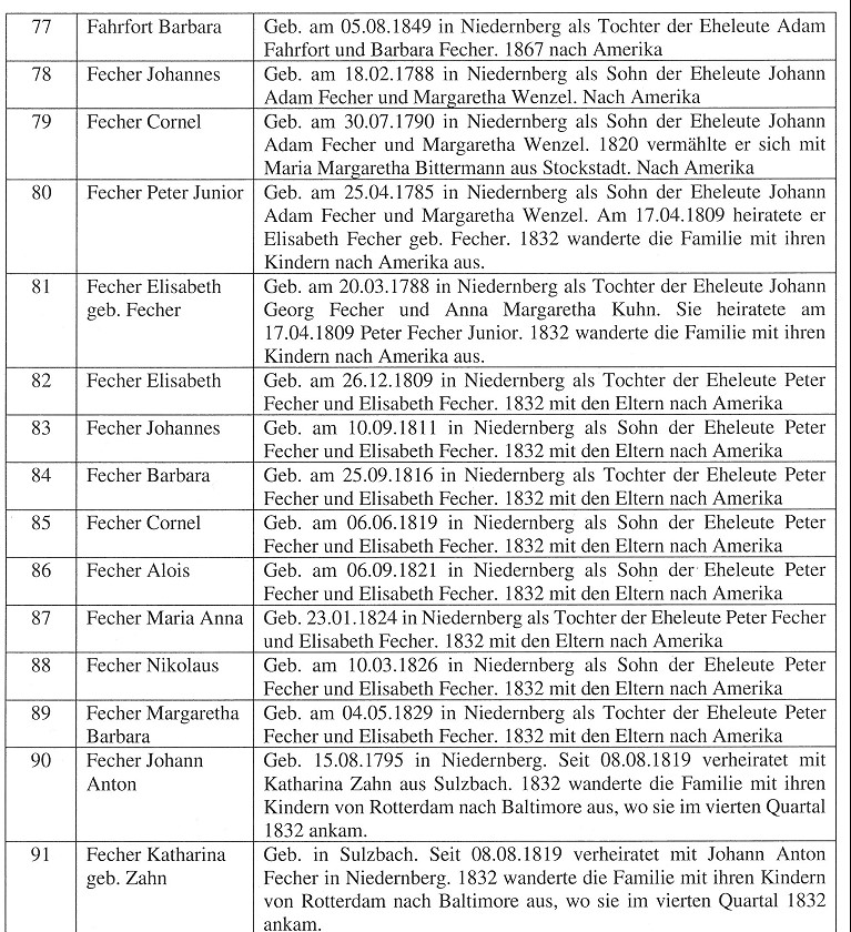 Überwiegend wanderten die im Bericht aufgeführten Familien nach Baltimore (Maryland, Ostküste USA, zwischen Washington u. Philadelphia/New York). Details über die beiden Familien Fecher findet man hier.... (Nr. 80/90, Auszug aus Heimatbuch 2)
