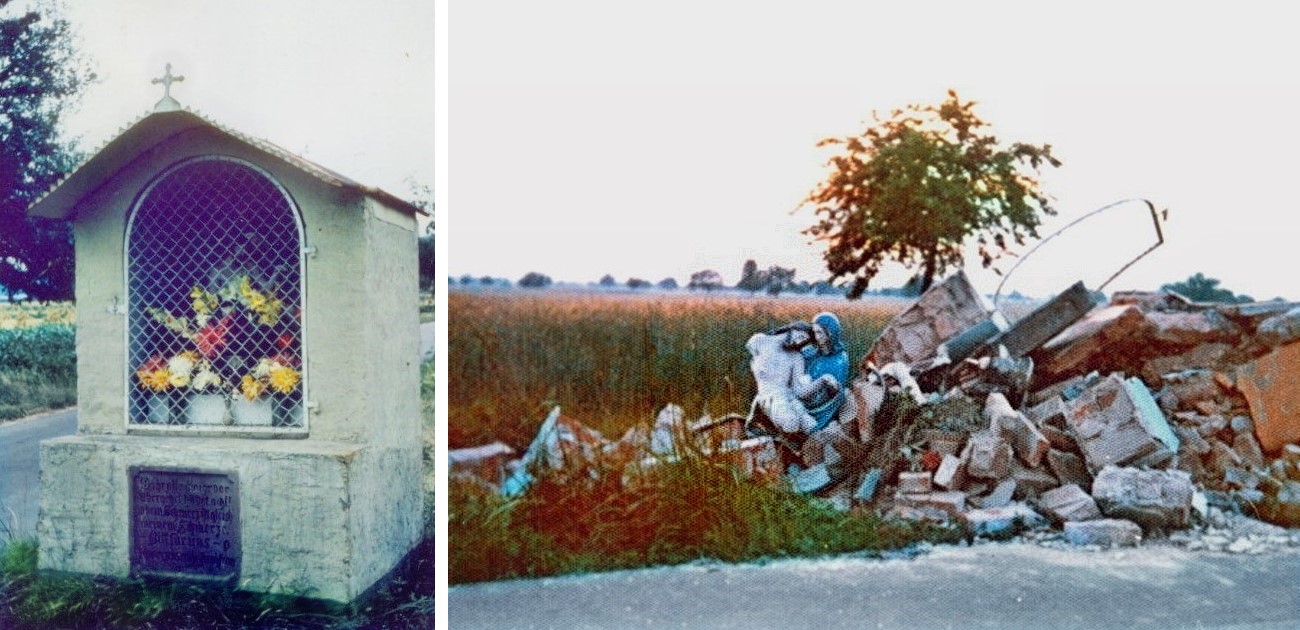 Aus Dankbarkeit für ihre glückliche Heimkehr aus dem Ersten Weltkrieg ließen im Jahr 1922 Karl Fecher, Anton Gerlach, Karl Seitz und Wendelin Wenzel am Waldweg den Bildstock „Schmerzhafte Muttergottes“ errichten. Er stand an der Abzweigung Waldweg/Unterer Waldweg (zwischen Kreisstraße und Bücke). Bei einem Autounfall 1972 wurde der Bildstock bis auf die beschriftete Sandsteinplatte zerstört. Die Sandsteinplatte wurde in den neu errichteten modernen Marienbildstock am Waldweg / Abzweig Leerweg mit einbezogen.
