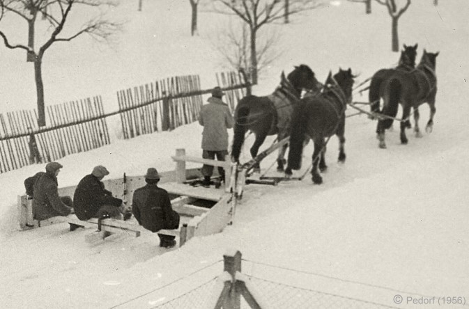 (Aus alten Gemeindeakten und mündliche Überlieferung. Foto: Der Schneepflug der Gemeinde Gumping (Niederösterreich) war etwas größer wie die Niedernberger Ausführung (Symbolfoto) und wurde von 4 Pferden der Gemeinde Amelsdorf gezogen. Der Fuhrmann steht vorne am Bug, drei Männer sitzen hinten auf der Holzkonstruktion des Bahnschlittens, um das notwendige Gewicht auf die Straße zu bringen. Aufnahme Winter 1955/56)