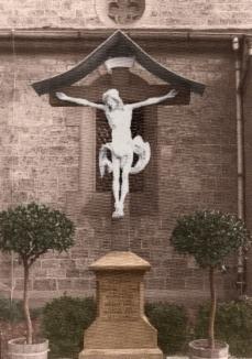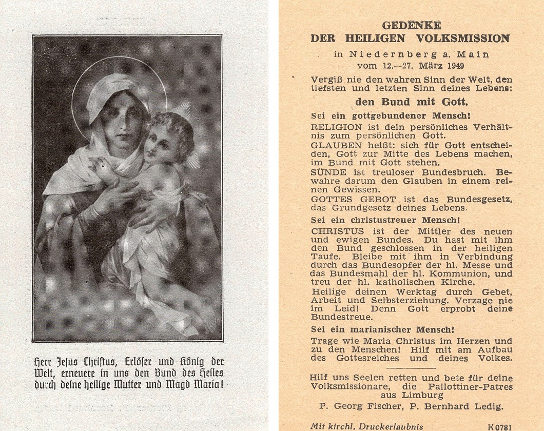 1962 fand in Niedernberg die letzte Volksmission statt (lt. Inschrift am Kreuz). In gewissen Zeitabständen wurden in der Kirche sogenannte Missionen durch Patres aus verschiedenen Orden abgehalten. Die Missionen dienten der Erneuerung und Auffrischung des Glaubens. Zur Erinnerung an diese Missionen wurde 1899 von Pfarrer Seubert ein Kreuz gestiftet. Auf dessen Sockel sind die Missionen von 1899 bis 1962 eingemeißelt. Das Missionskreuz stand Jahrzehnte vor der Kirche. 1980 wurde es in den Pfarrgarten hinter der Kirche versetzt. Dabei wurde der Korpus stark beschädigt und nicht mehr am Kreuz angebracht. (Heimatbuch Seite 521) Fotos: Das Missionskreuz vor der Kirche und Volksmission - Andenkenbildchen.