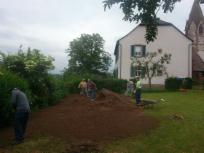 Im Herbst 1897 wurde die Mauer am Main entlang des Pfarrgartens errichtet. Bis zu diesem Zeitpunkt war der Garten zum Main hin offen und dem jährlichen Hochwasser ausgesetzt. Der Main war zu dieser Zeit noch nicht gestaut und das Gelände fiel schräg zum Wasser hin ab. Um diesen Teil des Grundstücks zu erhöhen, ließ der damalige Pfarrer Seubert den Aushub des Kirchenbaus (Kirchhoferde) dort ablagern. Wie er in seinen Aufzeichnungen schreibt, hat er beim Einebnen der Erde tausende von Totengebeinen aufgelesen, die er hinter der Kirche (auf ehemaligen Friedhofsgrund) beisetzte.