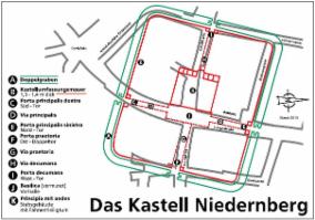 Niedernberg geht auf ein römisches Kastell zurück. Nach neuesten Erkenntnissen entstand es vermutlich um die Jahre 107 / 110 n. Chr. Die cohors I Ligurum et Hispanorum war hier stationiert. Die Truppe ist durch den Grabstein des Soldaten Marcellus und durch Ziegelstempel nachzuweisen. Die teilberittene Kohorte bestand aus ca. 500 Soldaten. Das Kastell hatte einen fast quadratischen Grundriss und eine Größe von ca. 2,2 ha. Es bestand vermutlich bis ca. 259 n. Chr., die Ruinen dürften aber bis zur Besiedlung durch die Franken im 8. Jh. noch sichtbar gewesen sein. Sehr wahrscheinlich waren die Steine willkommenes Baumaterial. Erst 1894 wurde das Steinkastell durch Stichgrabungen lokalisiert, da oberirdisch nichts mehr erkennbar war. Hauptstraße, Kirchgasse und Schulstraße gehen auf die damaligen Lagerstraßen zurück. Um die Größe des Kastells sichtbar zu machen sind die Eingangstore durch Bodenmarkierungen kenntlich gemacht.