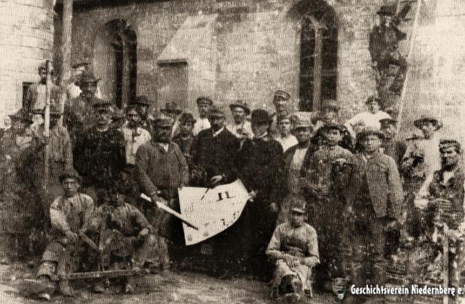 (Heimatbuch Teil 1, Seiten 455 – 465. Das nachträglich retuschierte, historische Foto zeigt die Bauarbeiter des Umbaus von 1897/98 zusammen mit Pfarrer Seubert, der einen Bauplan in der Hand hält. Man findet es in Albert Wagners Buch über die Pfarrei Niedernberg.