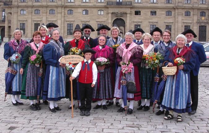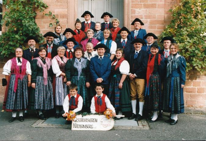 Gruppenfoto in Tracht zum 15-jährigen Vereinsjubiläum 2000, Eingang Sandsteinschule (XL-Foto, per Mausklick vergrößerbar)