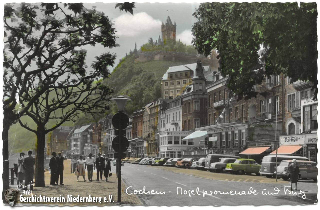Die Moselpromenade in Cochem - einem sehenswertes Städtchen an der Mosel, das durch seine schöne Altstadt, kleine Weinlokale und attraktive Freizeitangebote beeindruckt. Oben Im Hintegrund auf einem weithin sichtbaren Bergkegel die Burganlage der Reichsburg Cochem.